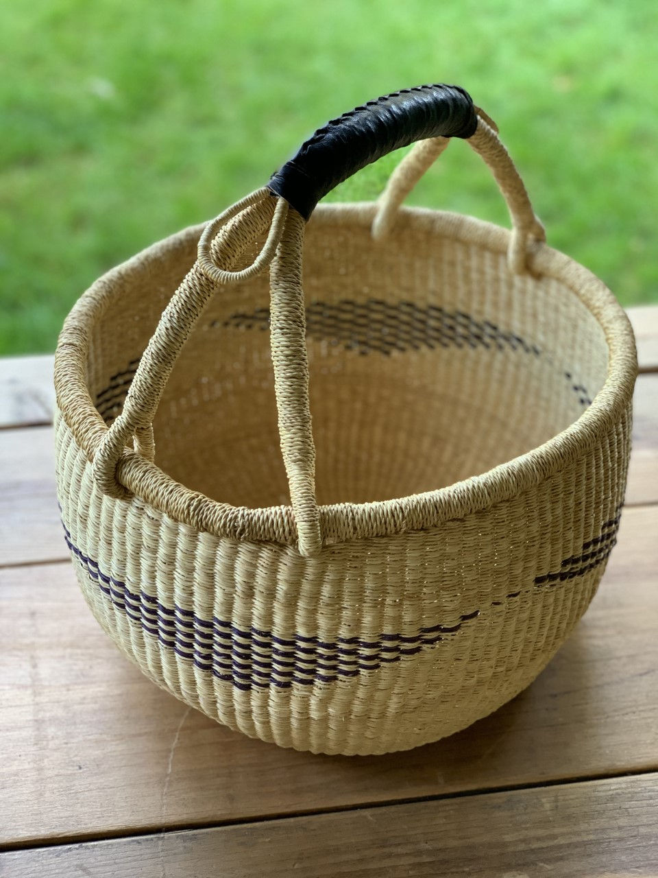 The artisans, part of a collective on the border of Ghana and Burkina Faso, take two to three days to hand weave each piece. Our products are completely sustainable: straw is procured locally, vegetable based dyes are used to dye the straw by hand and the weaving is all done by women in the collective.